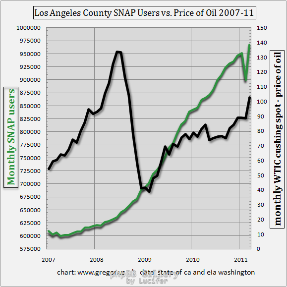 Στο διάγραμμα βλέπουμε πως ο αριθμός των συμμετεχόντων στο πρόγραμμα επηρεάζεται από την ανοδική τιμή του πετρελαίου. Η περίοδος που το πετρέλαιο έχασε μεγάλο ποσοστό της τιμής του ήταν αυτή του μεγάλου χρηματιστηριακού και οικονομικού κραχ οπότε και ο αριθμός των ανθρώπων με οικονομικά προβλήματα αυξήθηκε αντί να μειωθεί.