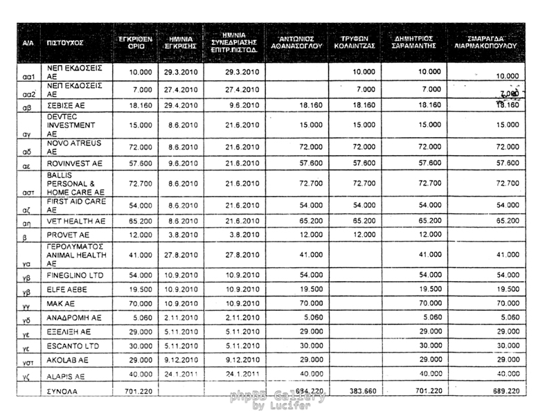 «...Οι θυγατρικές της Alapis Provet A.E, Alapis Medical and Diagnosticw AE, Γερολυμάτος Prestige AE, Γερολυμάτος Cosmetics ΑΕ, Beautyworks AE, Γερολυμάτος Animal Health AE,κ.λ.π. μεταβιβάστηκαν προς συνεργάτες του Λαυρ. Λαυρεντιάδη, που ήταν στελέχη του Ομίλου Alapis. Πολλοί από αυτούς ήταν μεταγενέστεροι μέτοχοι των εταιρειών, τις οποίες πούλησαν στον Όμιλο. Οι νέοι μέτοχοι δεν συνεισέφεραν με ίδια κεφάλαια στην αγορά των κλάδων και των θυγατρικών η οποία χρηματοδοτήθηκε από την τράπεζα... Μεγάλο μέρος των χορηγήσεων της Τράπεζας, δηλαδή ποσό 701.220.000 ευρώ διοχετεύθηκε σε επιχειρήσεις συμφερόντων Λαυρεντιάδη κατόπιν εγκρίσεων νέων πιστοδοτικών ορίων ή αύξησης πιστοδοτικών ορίων τις οποίες παρέσχαν υπό την ιδιότητα τους ως μέλη της Επιτροπής Πιστοδοτήσεων... »