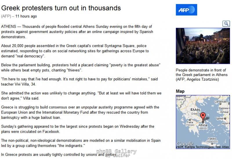 Στο ίδιο μήκος κυμαίνεται και το κείμενο του Reuters που αφορά τις εκδηλώσεις στην Αθήνα. Περίπου 30.000 κόσμου "είδε" η ελληνική αστυνομία και αναμετέδωσε το Reuters, το οποίο υπογραμμίζει: "Υποκινούμενοι από το Facebook, παρά από τα πολιτικά κόμματα και τα εργατικά συνδικάτα (οι Έλληνες) εναντιώθηκαν κατά των Ελλήνων πολιτικών και των ξένων δανειστών".