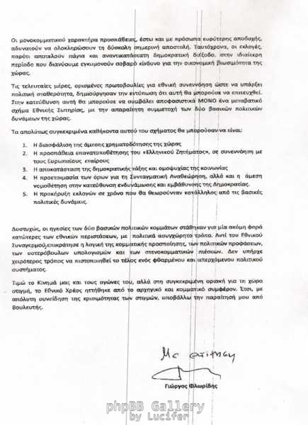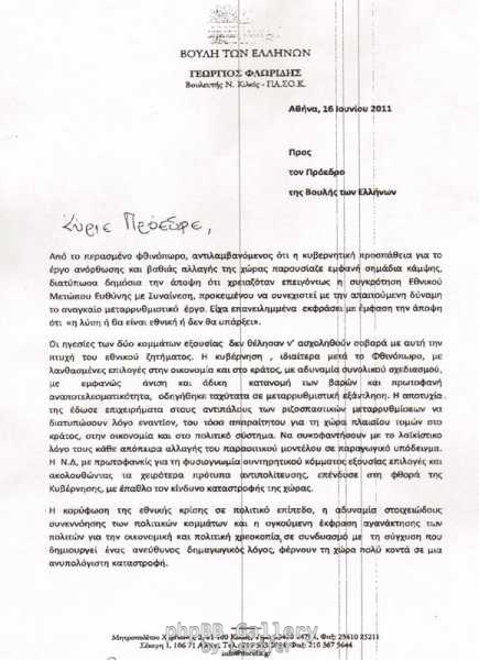 Σήμερα το πρωί ο Γ. Φλωρίδης κατέθεσε στον Πρόεδρο της Βουλής δισέλιδη επιστολή με την οποία παραιτείται από βουλευτής. Στην επιστολή χρησιμοποιεί σκληρή γλώσσα για τον πρωθυπουργό και τις επιλογές στον οικονομικό τομέα.