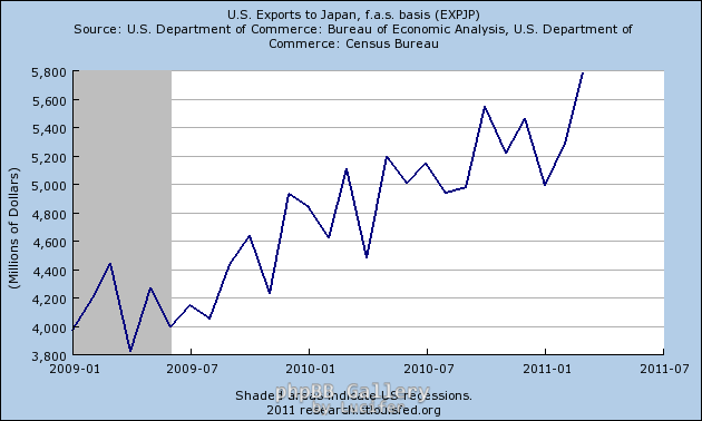 Για παράδειγμα, οι ΗΠΑ αναμένουν το 2011 να χάσουν τουλάχιστον 10 δις δολάρια από τη μείωση του αριθμού των Ιαπώνων που θα επικεφτούν τη χώρα τους αλλά οι απώλειες αντισταθμίζονται από την αύξηση της ζήτησης για αμερικανικά προϊόντα από την Ιαπωνία. Έτσι, ο δείκτης των αμερικανικών εξαγωγών στην Ιαπωνία πέρασε σε νέο μακροπρόθεσμο υψηλό στο πρώτο τρίμηνο του έτους.