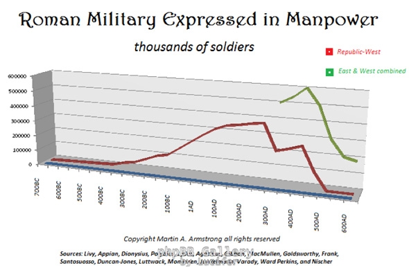 Στο διάγραμμα απεικονίζεται η θεαματική αύξηση του μεγέθους της στρατιωτικής δύναμης της Ρώμης όσο η συνταξιοδοτική 'φούσκα' μεγάλωνε και η κατάρρευση της όταν η Ρώμη δεν είχε πλέον τη δυνατότητα να υπόσχεται και να πληρώνει συντάξεις στους στρατιωτικούς.
