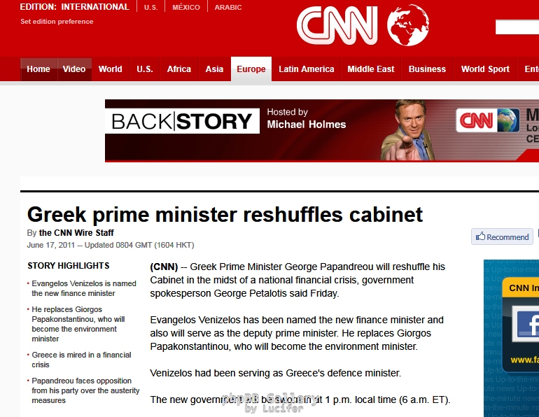 Το CNN έχει τίτλο: "Ο Έλληνας πρωθυπουργός 'ανακατεύει την τράπουλα' στην κυβέρνηση" και ο Ευάγγελος Βενιζέλος είναι το πρώτο πρόσωπο που αναφέρεται στο κείμενο.