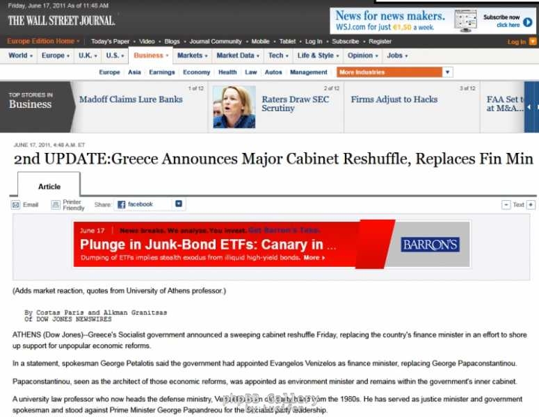 Ο τίτλος αναφέρει: "Ελλάδα: Ο Παπανδρέου επιλέγει τον Βενιζέλο ως υπουργό Οικονομικών".
